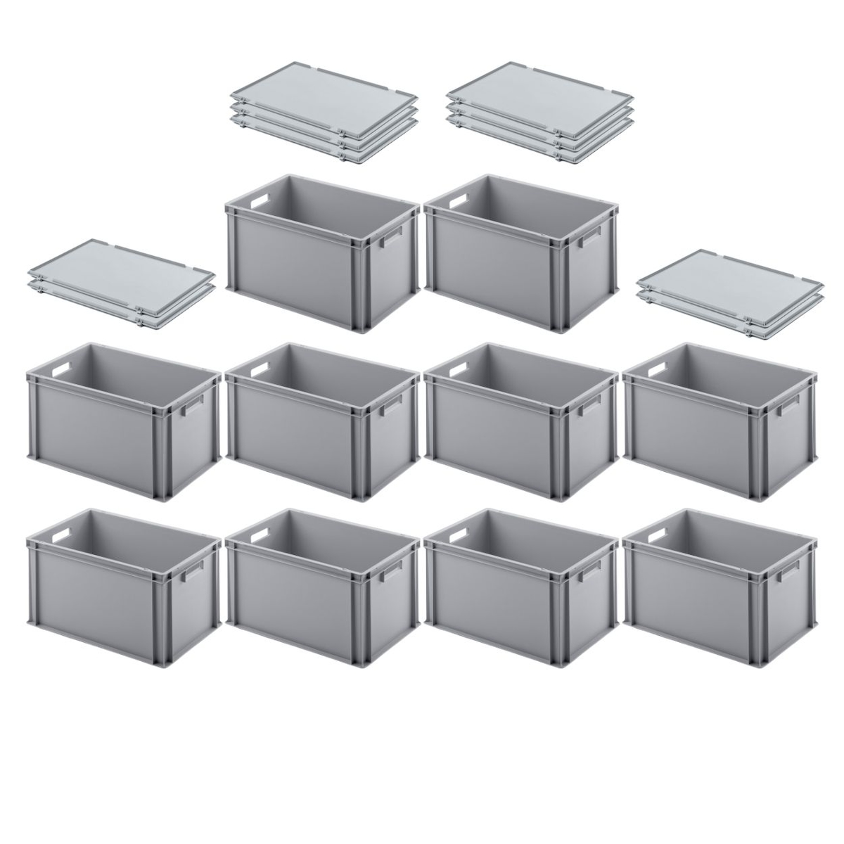 PROREGAL 10x Eurobehälter mit offenem Griff und Scharnierdeckel | HxBxT 32x40x60cm | 56 Liter | Grau | Eurobox