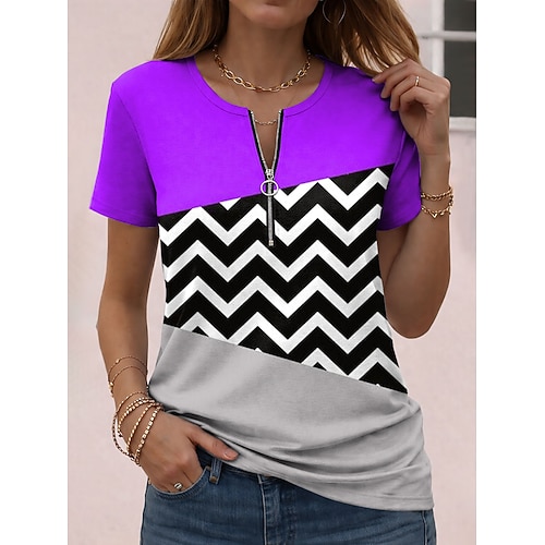 Per donna Maglietta Cerniera Blocco di colore Grafico Geometrico Blocco di colori Vintage Hawaiano Elegante Manica Corta Girocollo Top Regolari Quotidiano Sportivo Weekend Blu Rosa Viola Verde Estate