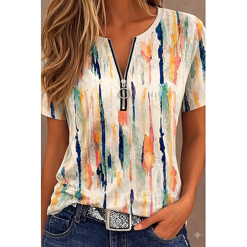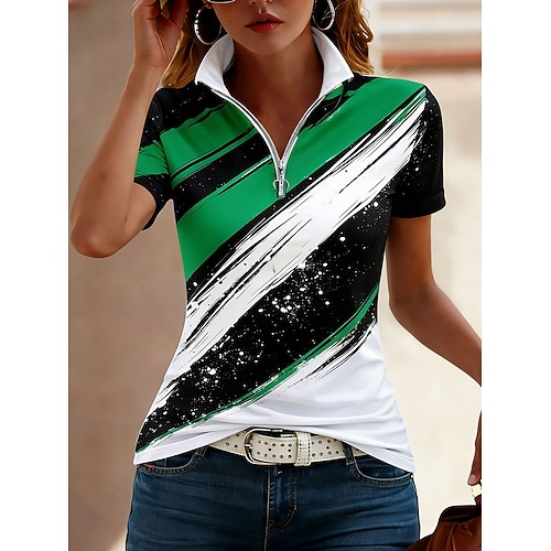 Per donna Maglietta Cerniera Zip a un quarto Grafico Geometrico Blocco di colori Tropicale Hawaiano Elegante Manica Corta Girocollo Scollo a V Top Regolari Quotidiano Sportivo Uscire Nero Bianco