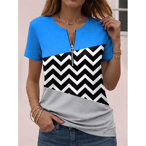 Per donna Maglietta Cerniera Zip a un quarto Grafico Geometrico Blocco di colori Tropicale Hawaiano Elegante Manica Corta Girocollo Top Regolari Matrimonio in Spiaggia Quotidiano Sportivo Blu Nero