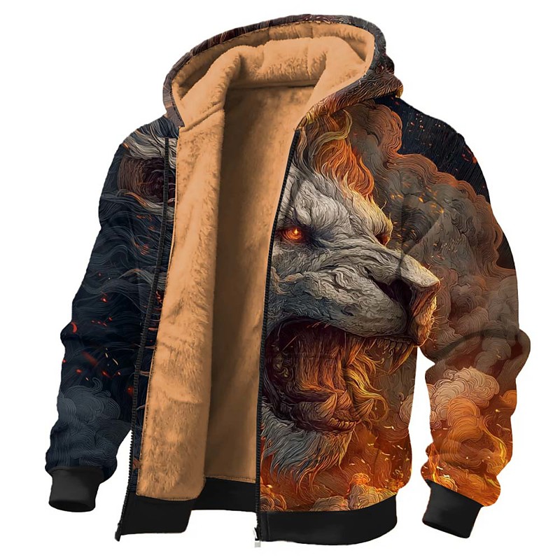 Men's Lion 3D Fleece Hoodie Jacket Sweatshirt Fantasy Crew Neck Outdoor Camping Black Blue Zip Up Fall Winter Designer S M L XL 2XL 3XL