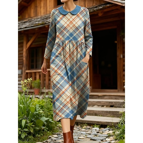 Per donna Abito Midi Tubino Abito Pieghettato Vacanza Casual Boho Ferie Abito Primaverile Vestibilità regolare Plaid Manica Lunga Girocollo Blu Rosso Azzurro cielo Arancione Primavera Autunno