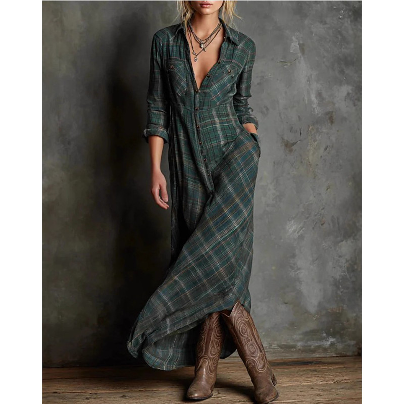 Women's Maxi Dress Shift Dress Vacation Casual Boho Daily Holiday Going out Regular Fit Plaid Long Sleeve Lapel Deep Green Fall Winter