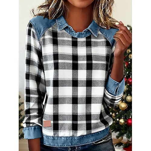 Women's Pullover Sweatshirt Graphic Plaid Casual Long Sleeve Crew Neck Crop Tops Street Dailywear Casual Black Yellow Blue Brown Fall Winter