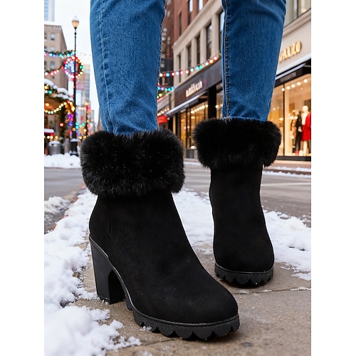Schwarze Damen-Ankle-Boots aus Kunstwildleder mit Pelzbesatz – warm und stylisch, perfekt für Winter, Freizeit und die Weihnachtszeit