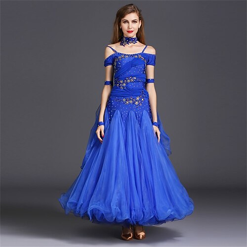 abito da ballo da sala da donna blu reale con strass di cristallo, manica lunga, abito da competizione per valzer, foxtrot, quickstep