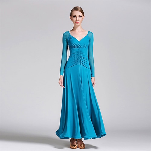 abito da ballo da sala color verde acqua con maniche lunghe, elegante corpetto aderente per latino ballo sociale