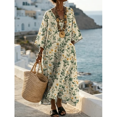 Per donna Abito lungo maxi Abito Boho Vestito Casual Vintage Quotidiano All'aperto Spiaggia Vestibilità comoda Floreale Manica Corta Collo a U Verde Estate Primavera