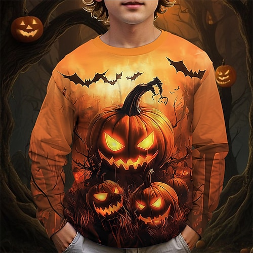 Halloween Jungen 3D Kürbis T-Shirt Langarm Frühling Herbst Mode Basic Kinder 4-12 Jahre Rundhalsausschnitt Outdoor Lässig Täglich Normale Passform