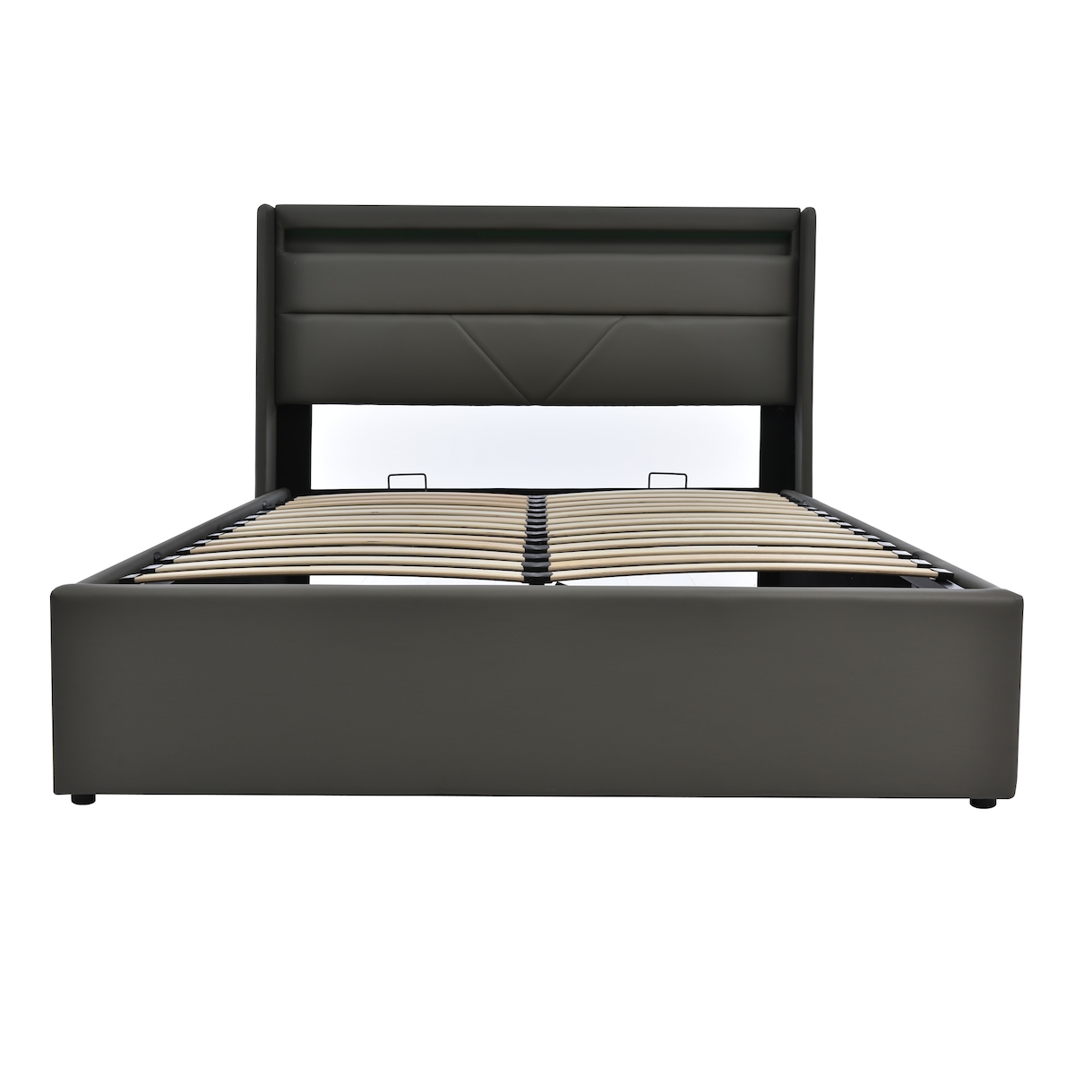 OKWISH Hydraulisches Stauraumbett 140 × 200 mit LED-Beleuchtung Polsterbett PU-Bezug Komfortmatratze 620 Federn moderner Stil für Schlafzimmer Grau