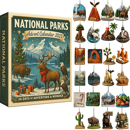 Calendario dell'avvento dei parchi nazionali 2025, calendario del conto alla rovescia di Natale di 24 giorni con 24 paesaggi e animali selvatici, ornamenti da collezione dei parchi nazionali americani, regalo per gli amanti della natura e le famiglie.