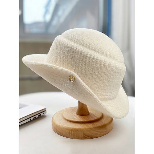 cappello in feltro di lana da donna, disponibile nei colori bianco e nero, stile elegante con decorazione a bottone dorato, perfetto per matrimoni e banchetti