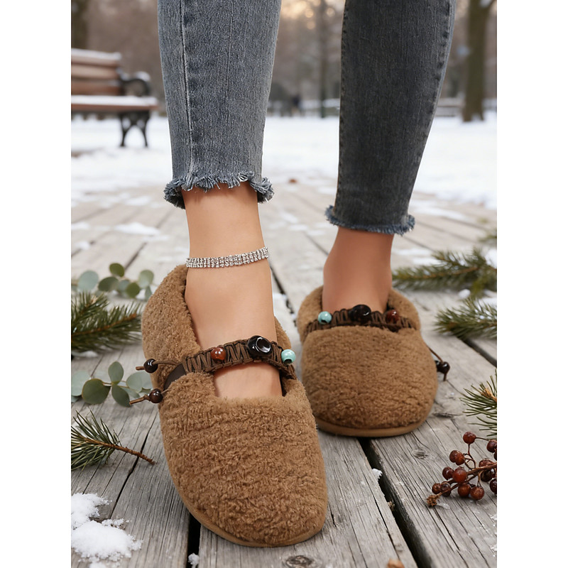 Women's Dark Brown Fuzzy Wide Fit Mary Jane Shoes with Boho Beaded Strap – Warm Plush Fleece Flat Shoes for Indoor House Comfort Outdoor Errands