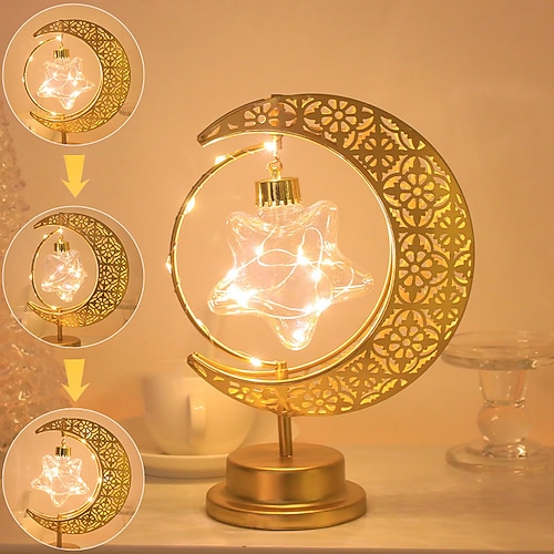 Lampada da scrivania decorativa in ferro battuto per Ramadan Eid, lanterna a forma di stella e luna, lampada da atmosfera per camera da letto, scatola per batterie AAA 26 17 cm