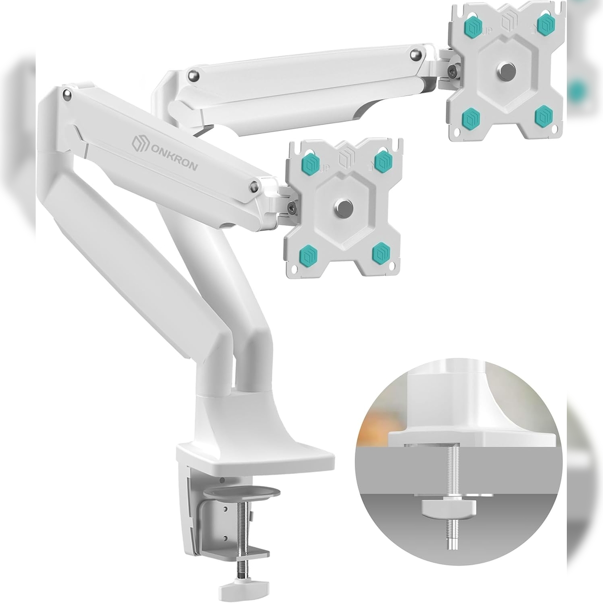 ONKRON Dual Monitor Halterung für 13-32 Zoll, bis 9 kg (x2), VESA 75x75 & 100x100, schwenkbar, neigbar, drehbar, Weiß G200-W