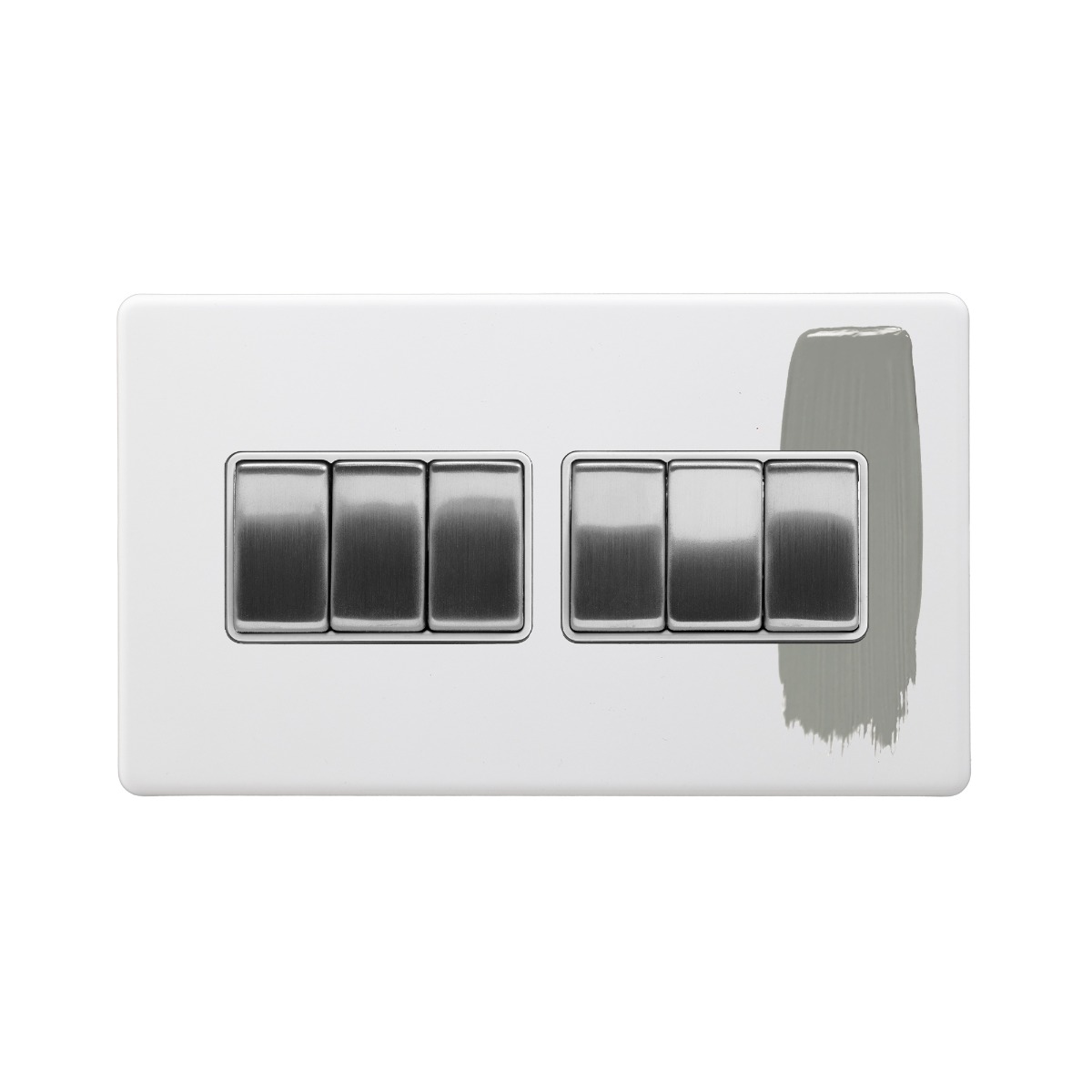 Soho Lighting Primed Paintable 6 Gang 2 Way 10A Light Switch with Brushed Chrome Switch and White Insert - Size: 86mm x 146mm x 4.5mm