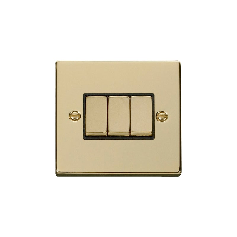 Click Deco 3 Gang 2 Way Ingot 10AX Switch Polished Brass Black Inserts