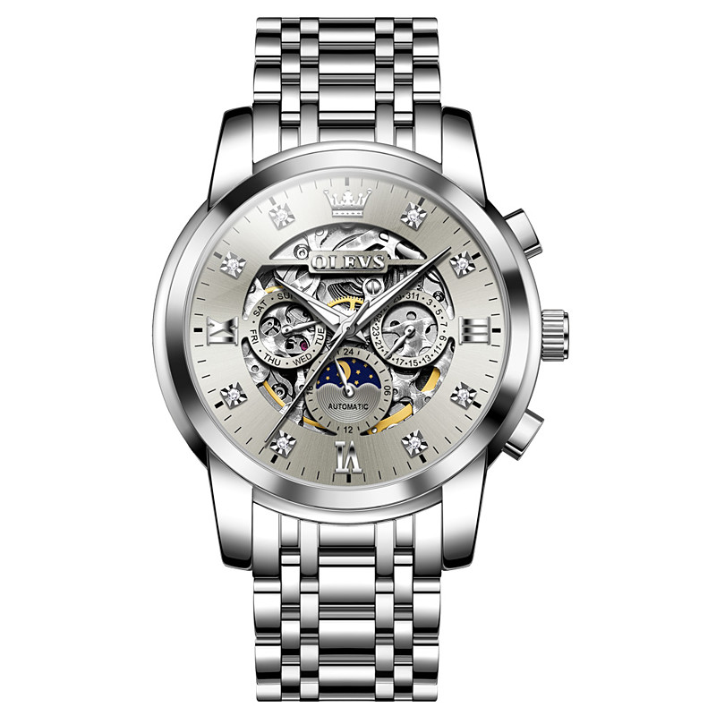 OLEVS Men Mechanical Watch Calendar Luxury Waterproof Wristwatch Automatic Self-winding Moon phase Dual Display Calendar Stainless Steel Strap Watch