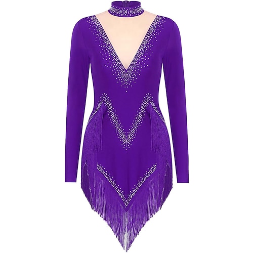 Abito da ballo latino con frange, nappe, cristalli/strass, allenamento da donna, senza maniche, chinlon alto
