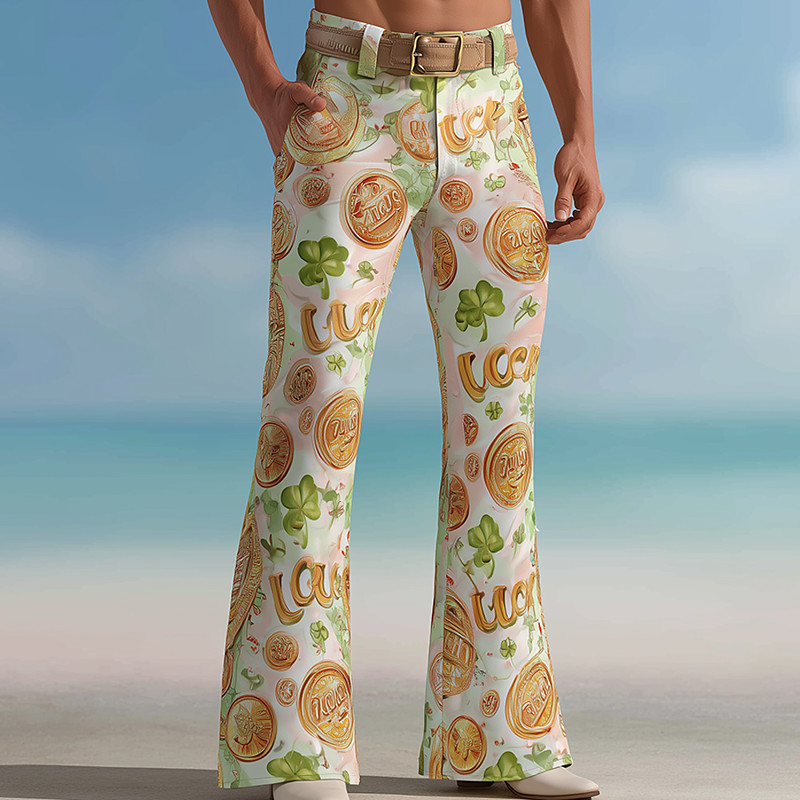 St. Patrick's Day Men's Four Leaf Clover Lucky Clover Gold Coin Trousers Disco Pants 60s 70s Bell Bottoms Mid Waist Vintage Retro Holiday Side Pockets Flared Leg Pants Trousers Spring Fall 3D Print