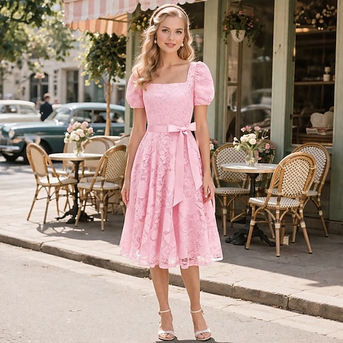 Elegante Anni 1950 Midi Vestito Maniche corte Manica a Palloncino Pizzo Fiocco Floreale Linea ad A Costume Per donna Casuale Feste Abbigliamento Quotidiano Adulti Vestito Primavera Estate