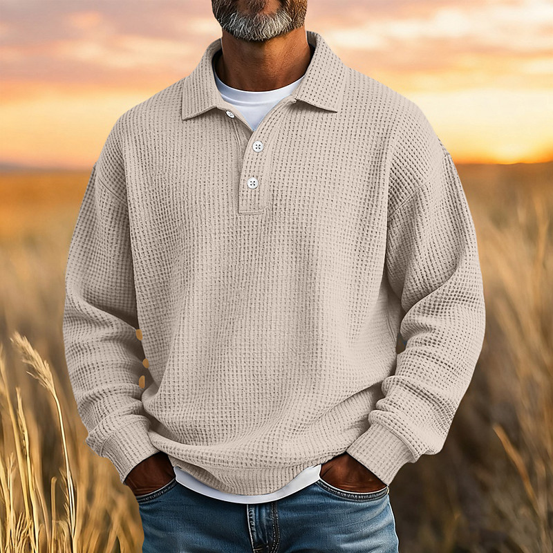 Men's Waffle Polo Shirts Textured Street Casual Lapel Long Sleeve Basic Modern Plain Textured Buttons Spring Fall All Seasons Regular Fit White Black Yellow Light Blue Burgundy Gray Waffle Polo Shirts