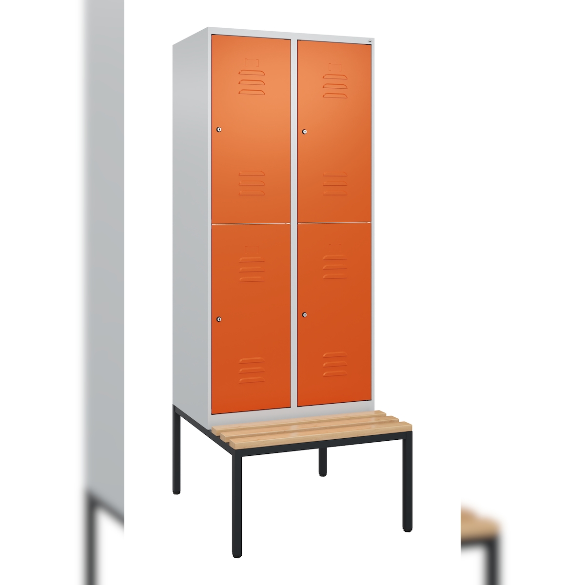 C+P Spind Classic PLUS, Kunststoff untergebaute Sitzbank, 2 Abteile, HxBxT 212x60x82cm, Zylinderschloss, Hellgrau/Reinorange von PROREGAL