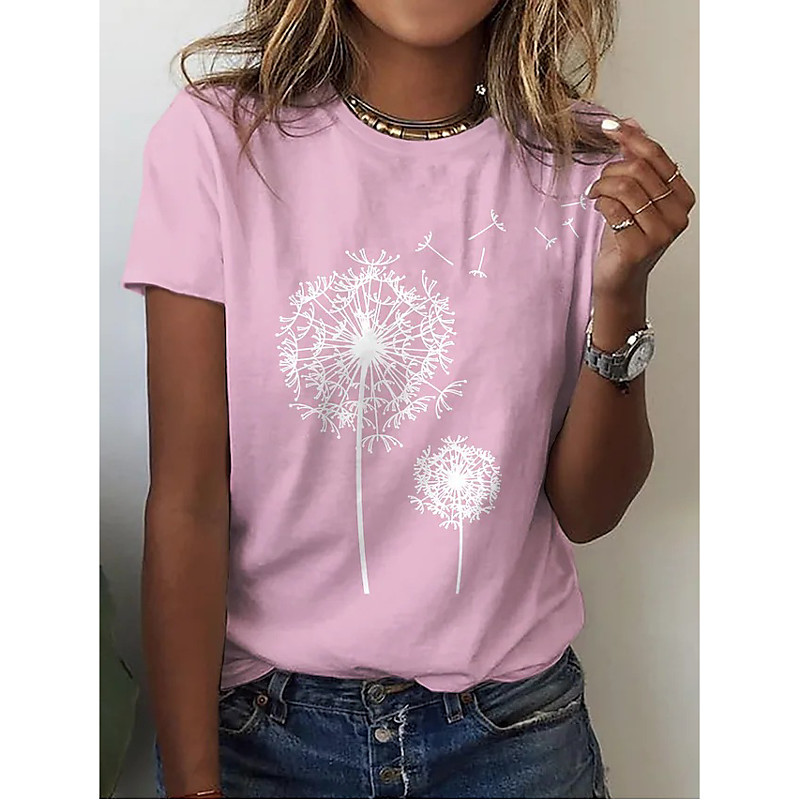Women's Casual T-Shirt Dandelion Print Crew Neck White Short Sleeve Summer Wear Comfort Fit Daily Essential