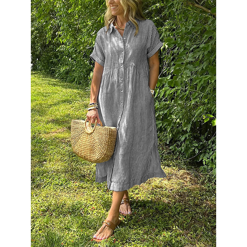 Women's Midi Dress Cotton Maxi Dress Casual Loose Fit Stripe Short Sleeve Shirt Collar Lapel Light Yellow Black White Yellow Summer Spring Fall