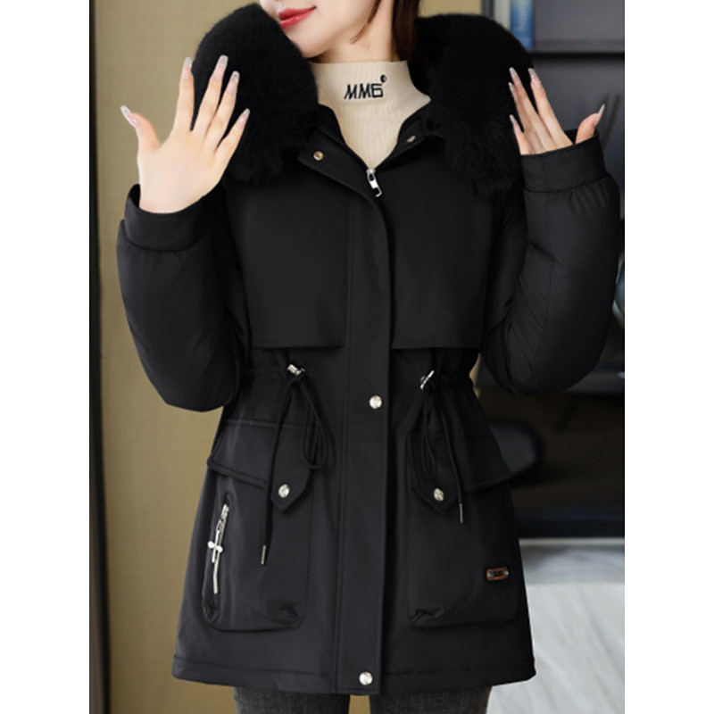 Women's Parka Comfortable Breathable Zipper Pocket Fur Collar Casual Plain Vacation Street Casual Daily Wear Zipper Regular Hooded Regular Fit Long Sleeve Outerwear Black White Khaki Spring Fall