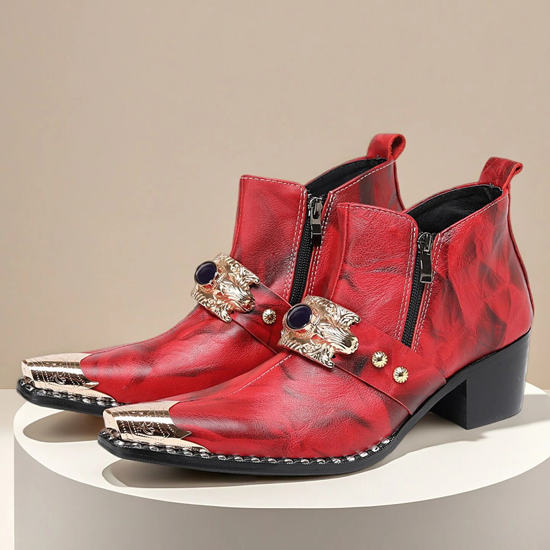 Men's Red Leather Boots with Skull Detail and Zipper Closure – Bold and Stylish for Christmas Parties and Festive Events