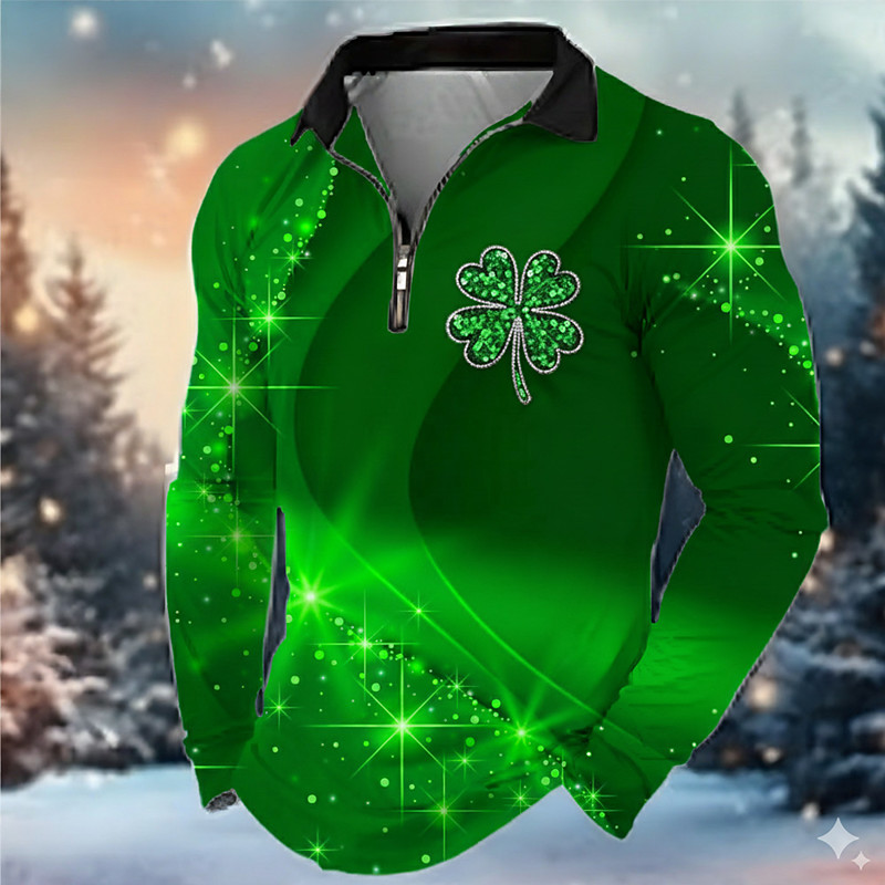 St. Patrick Men's Geometic Polo Long Sleeve Turndown Leisure Athleisure Casual Daily Festival Zipper 3D Print Spring Green
