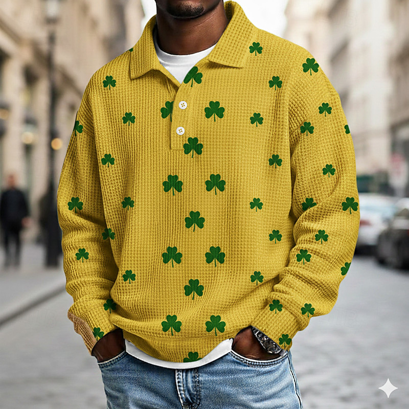St. Patrick Men's Clover Waffle Polo Shirts Polo Long Sleeve Polo Shirts Lapel Casual Athleisure Daily Wear Festival Outfit 3D Print Spring White Yellow Purple