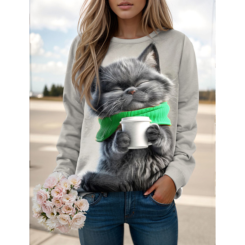 Women's Pullover Sweatshirt Graphic Animal Cat Casual Long Sleeve Crew Neck Regular Tops Casual Street Holiday Print Blue Yellow Pink Red Green Spring Fall Winter