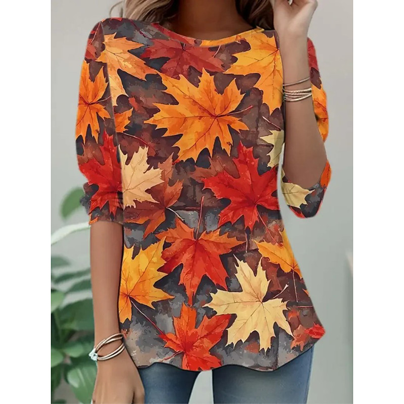 Women's T shirt Long Sleeve Crew Neck Long Sleeve Tunic Casual Print Regular Tops Daily Orange Spring Fall Prefall