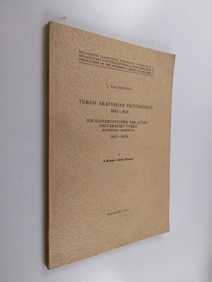 Jorma Vallinkoski : Turun akatemian väitöskirjat 1642-1828. [I], 3 : A. Kempe - Æsch. Petraeus Die Dissertationen der alten Universität Turku ...