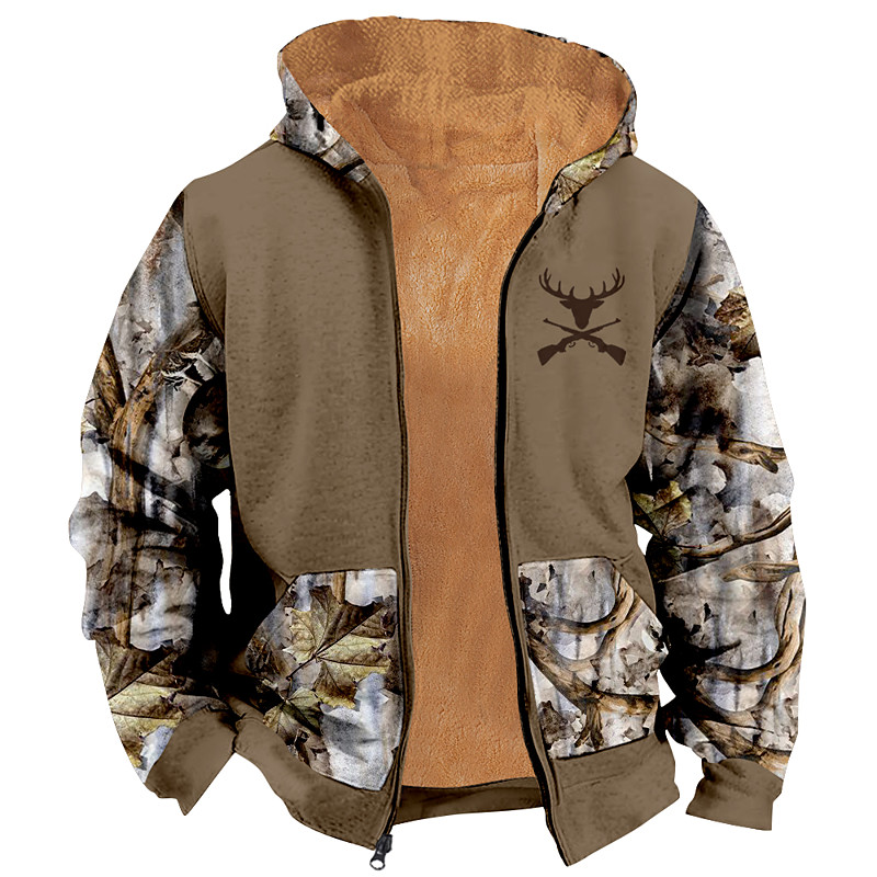 Men's Camo Camouflage Deer Fleece Hoodie Jacket Sweatshirt Classic Military Hunting Long Sleeve Crew Neck Outdoor Camping Black Brown Gray Zip Up Fall Winter Designer S M L XL 2XL 3XL