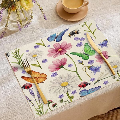 Tovaglietta da tavola in tessuto con motivo floreale e farfalle, 100% poliestere, rettangolare, con disegno di farfalle e piante verdi, lavabile in lavatrice, resistente e termoresistente.