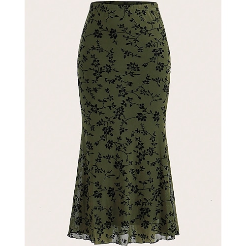Per donna Gonna Casual Midi Misura del girovita medio Gonne Floreale Stampato Inelastico Quotidiano Streetwear Nero Verde scuro Primavera Spandex Poliestere