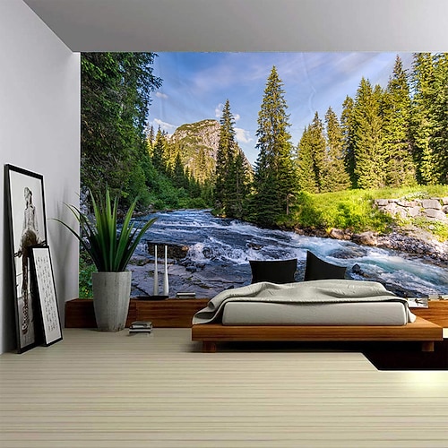 Wandteppich mit idyllischem Seeblick, Naturlandschaft mit Sonnenstrahlen, Waldweg und üppigem Grün – die perfekte Wanddekoration für Schlaf- oder Wohnzimmer, ein friedliches und ruhiges Wohnambiente.