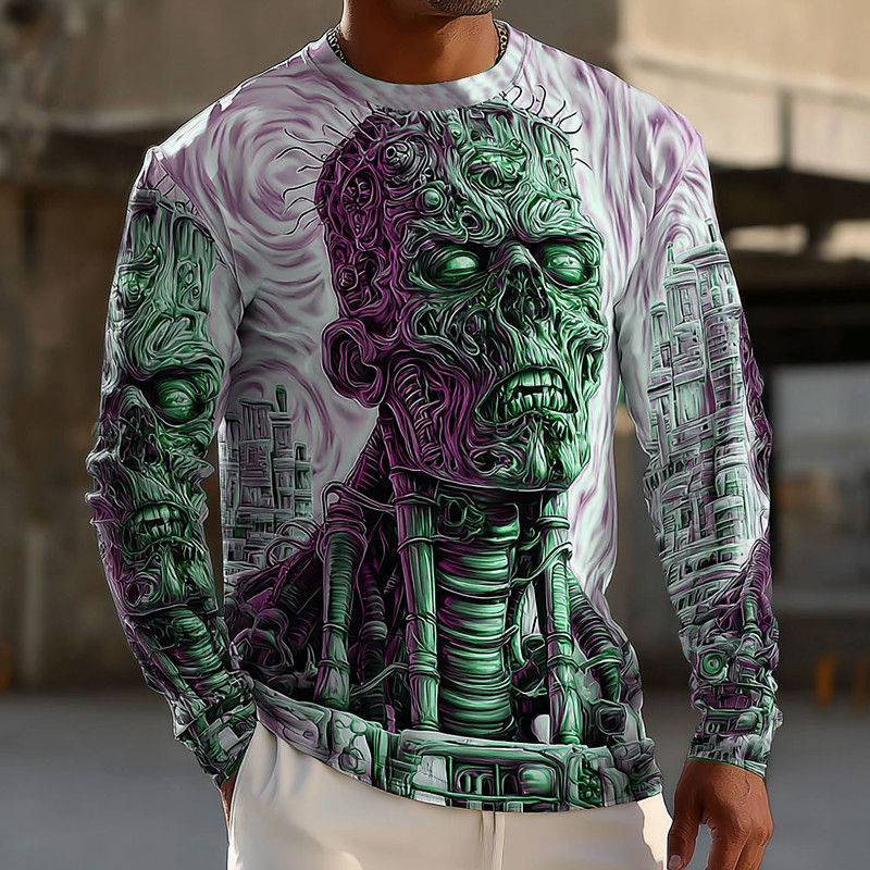 Halloween Men's Optical Illusion Zombies 3D T Shirt Long Sleeve T shirt 3D Print Crew Neck Shirt Fashion Exaggerated Street Casual Daily Blue Green Gray Summer Spring Fall Clothing Apparel S M L XL