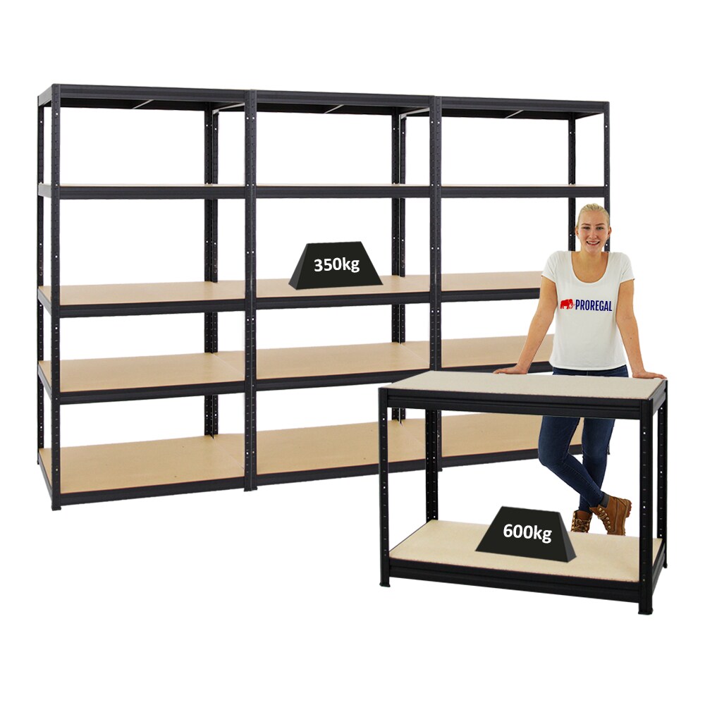 PROREGAL Mega Deal | 3x Schwerlastregal Slim Elephant M & 1x Höhenverstellbare Werkbank Slim Dino | Fachlast bis zu 600kg | Schwarz | Stecksystem
