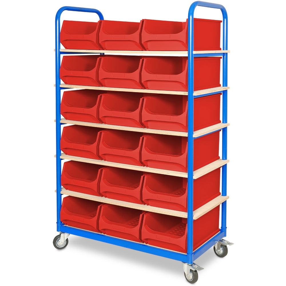 BRB Etagenwagen mit 6 Ebenen, BxTxH 1050x500x1690 mm, mit 18 Sichtlagerkästen LB2 (rot)