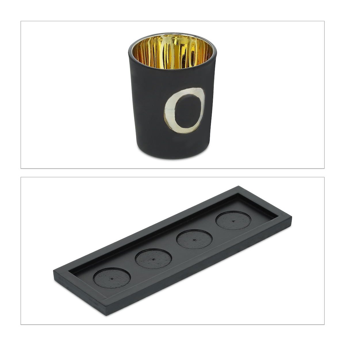 Relaxdays Teelichthalter Set mit Tablett & Steinen, 33 cm, Tischdeko Wohnzimmer, Esszimmer, Teelichtgläser Home, schwarz