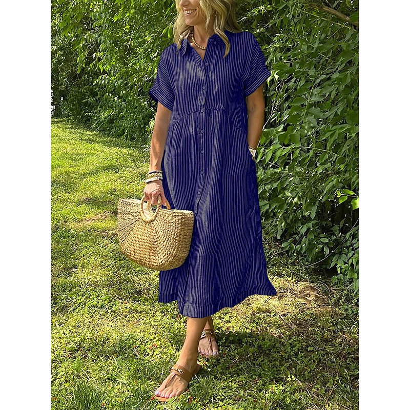 Women's Midi Dress Cotton Maxi Dress Casual Loose Fit Stripe Short Sleeve Shirt Collar Lapel Light Yellow Black White Yellow Summer Spring Fall
