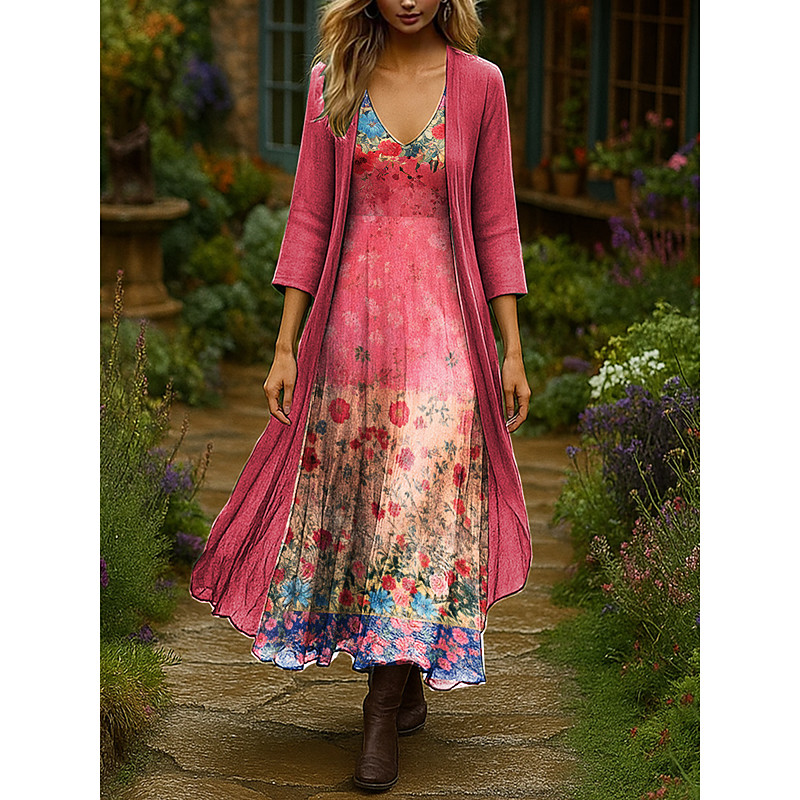 Women's Dress Set Maxi Dress A Line Dress Vacation Boho Floral Graphic Layered Print Maxi Dress 3/4 Length Sleeve V Neck Outdoor Daily Red Blue Light Purple Summer Spring Regular Fit