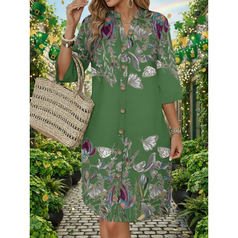 Women's Maxi Dress Kaftan 3/4 Length Sleeve Crew Neck Casual Dress A Line Dress Boho Loose Fit Floral Graphic V Neck White Yellow Light Green Green Spring Fall