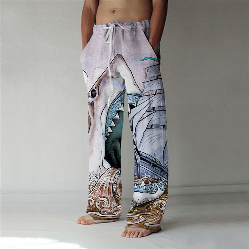 Men's Trousers Summer Pants Baggy Beach Pants Elastic Drawstring Design Front Pocket Straight Leg Shark Graphic Prints Comfort Soft Casual Daily For Vacation Linen Like Fabric Fashion Streetwear Blue