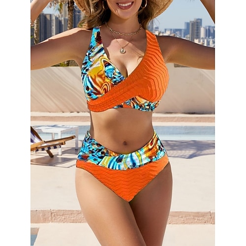 Costume da bagno bikini da donna a 2 pezzi arricciato colorblock cheeky slim senza schiena abbigliamento da spiaggia per le vacanze grafico geometrico scollatura a V senza maniche