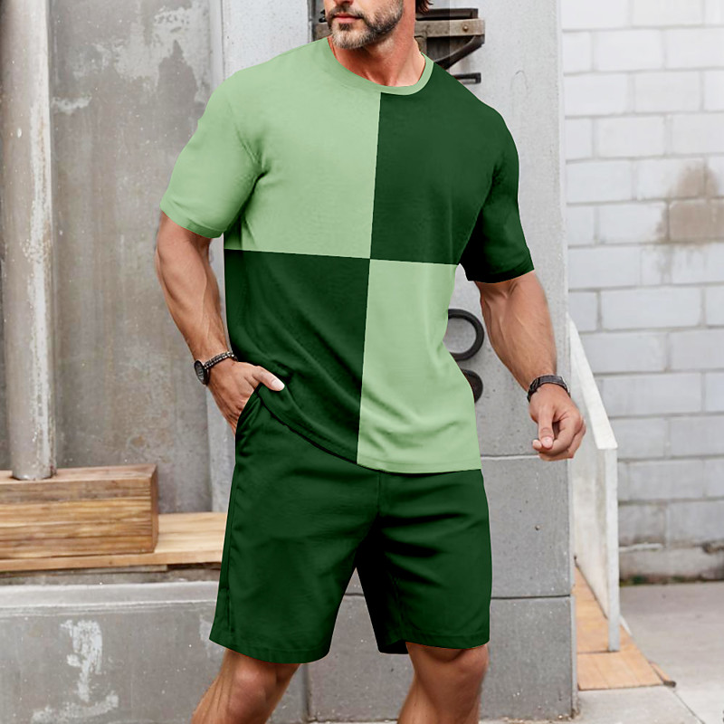 Men's Color Block 2pcs Tees sets Summer Tops Short Sleeve Short Pants Crew Neck Sport Casual Outdoor Vacation Sport 3D Print Summer Green Yellow Blue